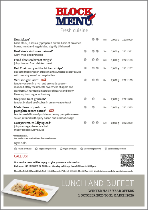 The advantages are clear: a wide range of products, exceptional quality and absolute freshness. The traditional preparation of the finest and freshest ingredients ensures consistently high quality. Moreover, optimal portion sizes allow you to make accurate and economical calculations.